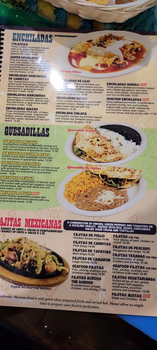 The menu also highlights flavorful Enchiladas such as Yolandas and Super Enchiladas, while the Quesadillas, ranging from Quesadilla Rellena to Quesadilla Deluxe, are perfect for those who want a cheesy, grilled delight. The Fajitas De Pollo and Fajitas De Camaron provide sizzling choices for lovers of tender meats and seafood. Chicken lovers can opt for the Pollo Don Polo or Chori-Pollo, while steak and pork dishes like Bistec Ranchero and Carnitas Dinner are also available.